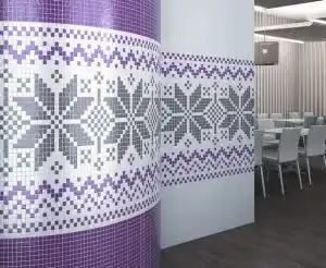 Посредством мозаичной плитки возможно создавать картинки либо орнаменты.